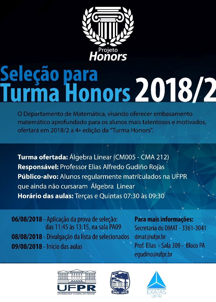 Informações sobre a Turma Honors de Álgebra Linear que será ofertada no 2º Semestre de 2018.